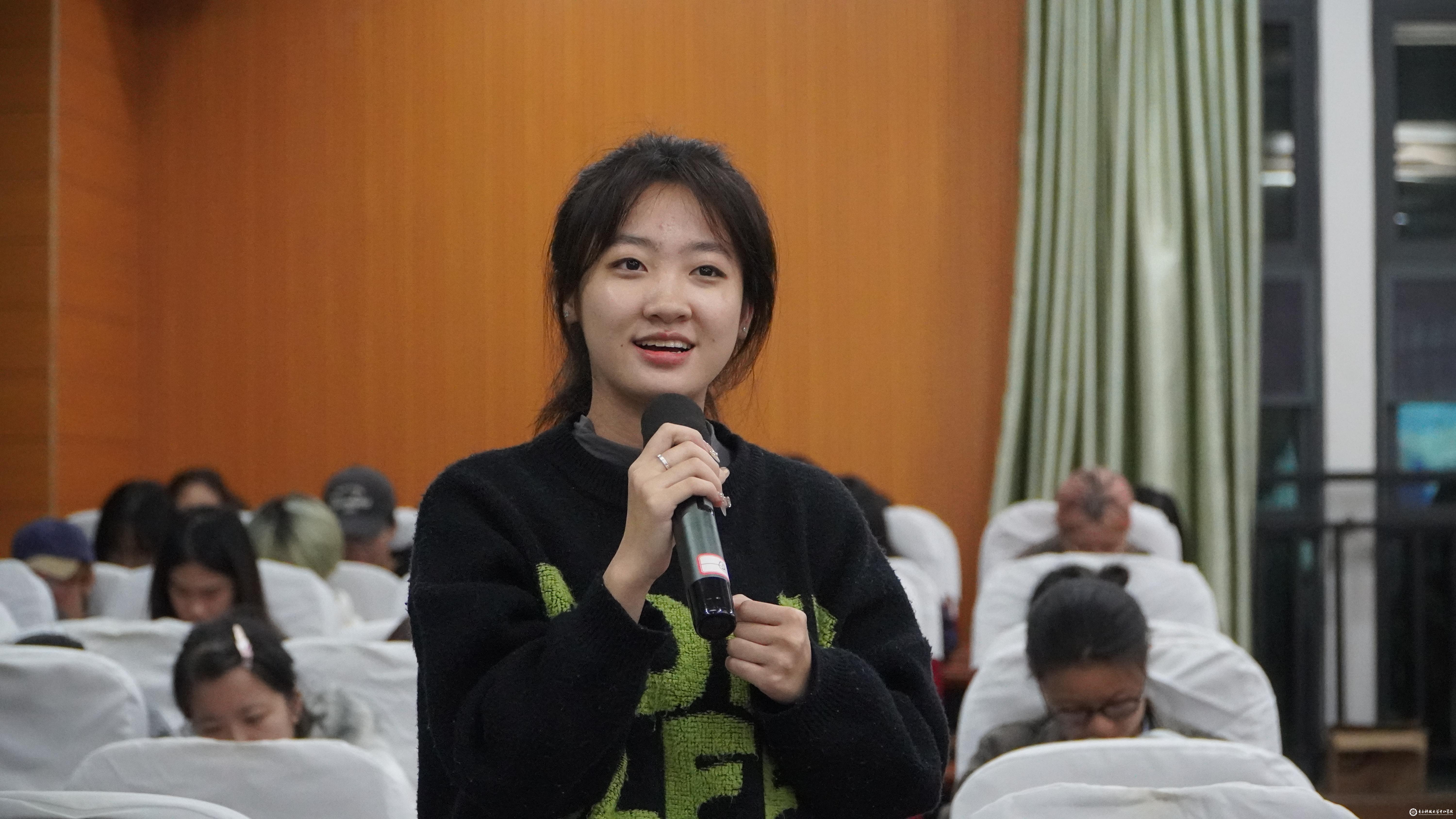 讲座过程中,郑咏梅以其深厚的专业知识和丰富的实践经验,赢得了在场师生的阵阵掌声。在提问环节,几位同学就AI在公益广告制作中的具体应用和优势提出自己的疑问,郑咏梅耐心解答,给出建议。